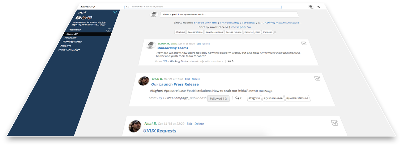 Shrtct starts with a hash. Bring your team members in and Shrtct leads the rest. All of your discussions are automatically grouped, and ideas are easy to pickup.